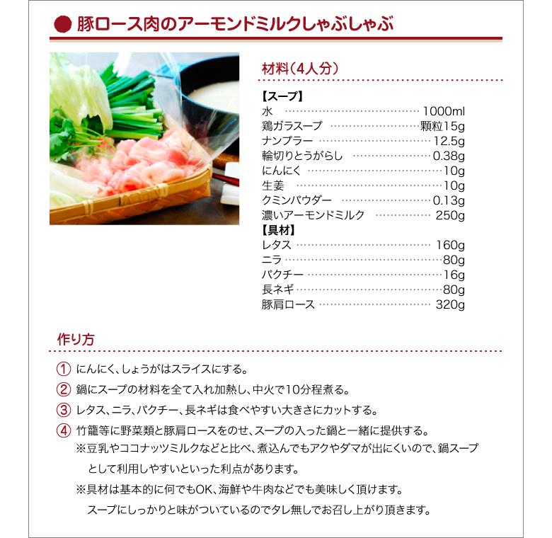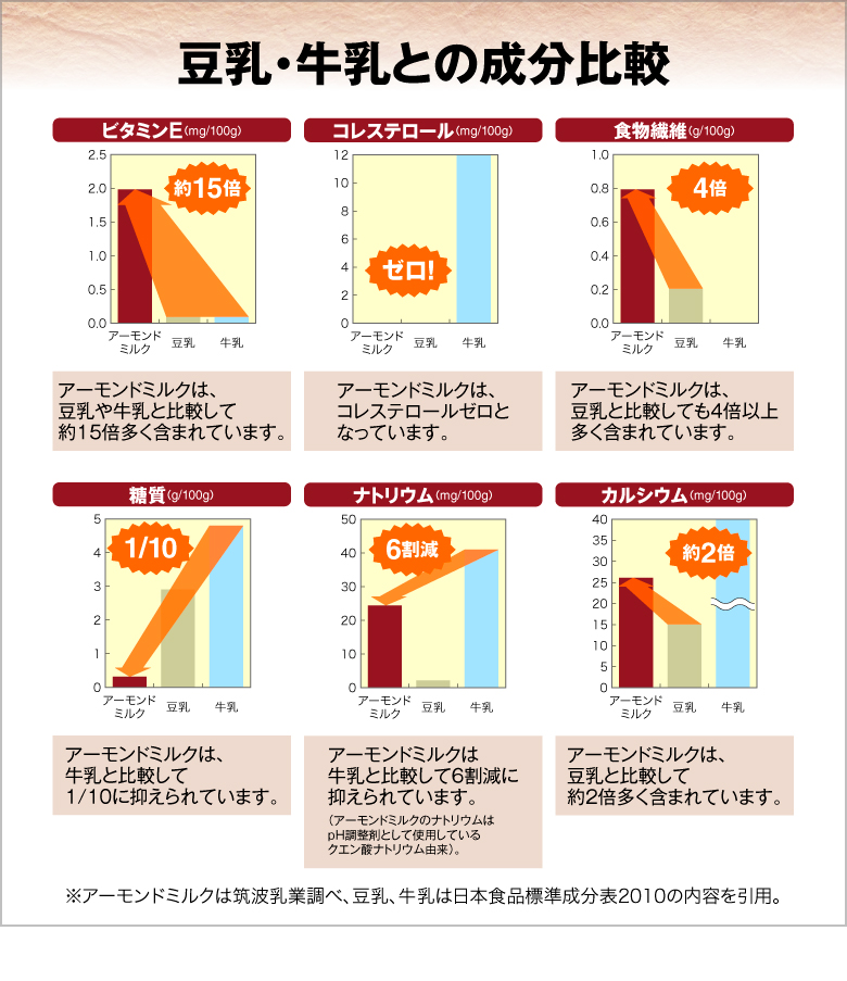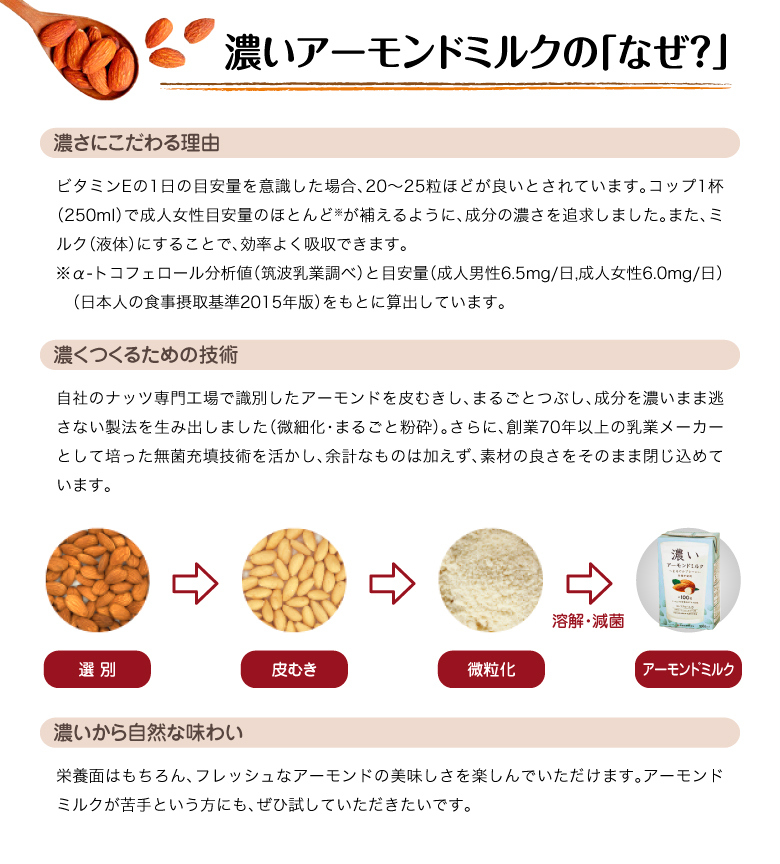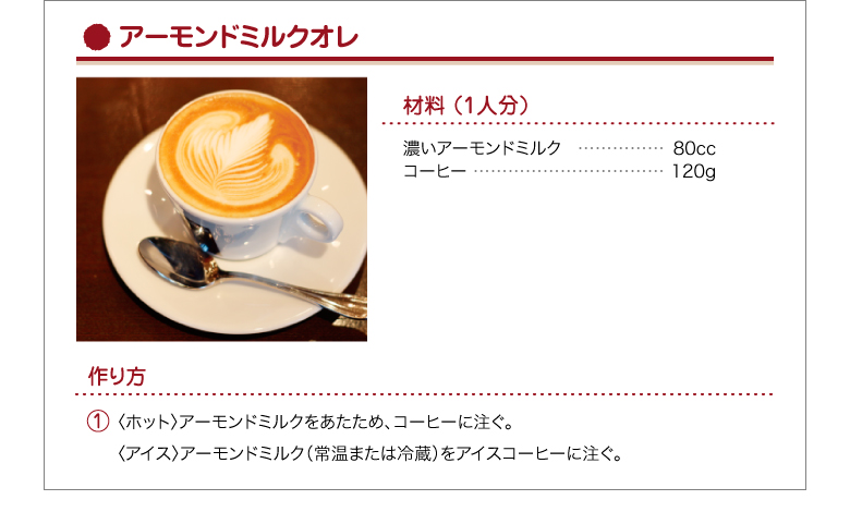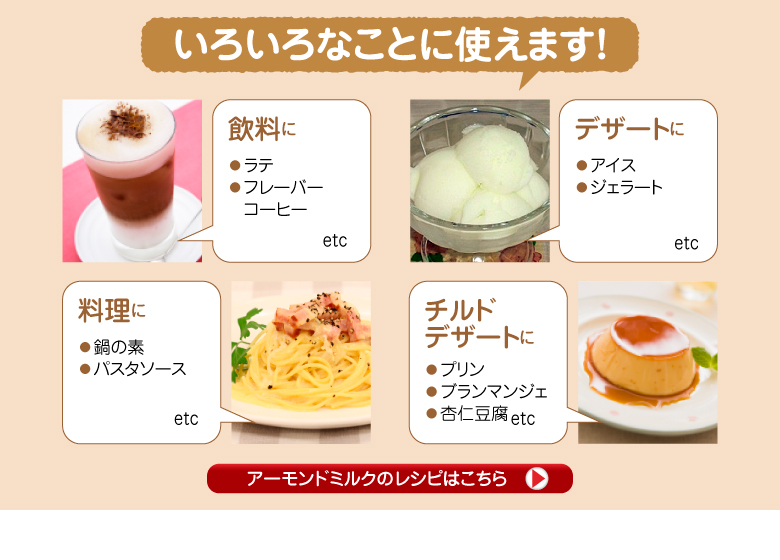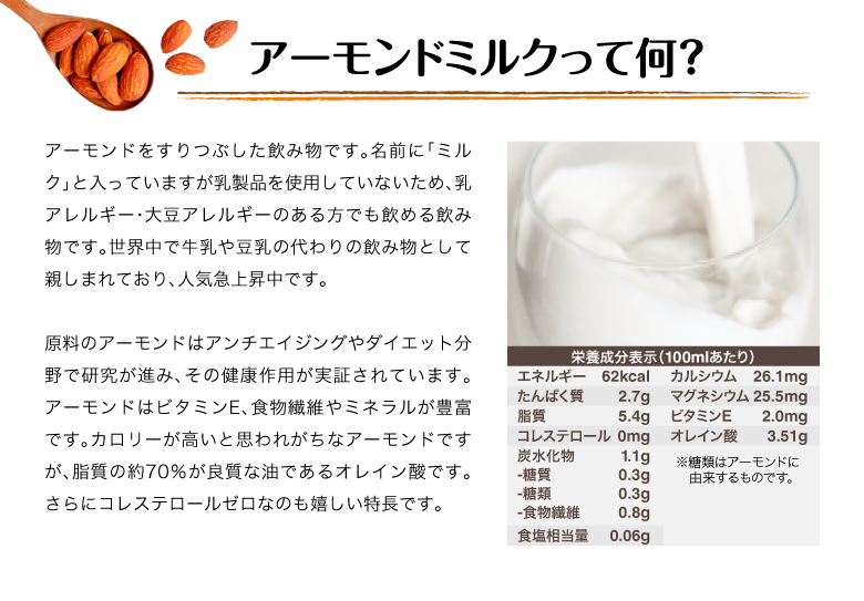 | その他 | ※アーモンドの成分が沈殿することがありますが、品質には問題ありません。よくかき混ぜてお使いください。 |