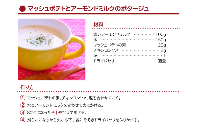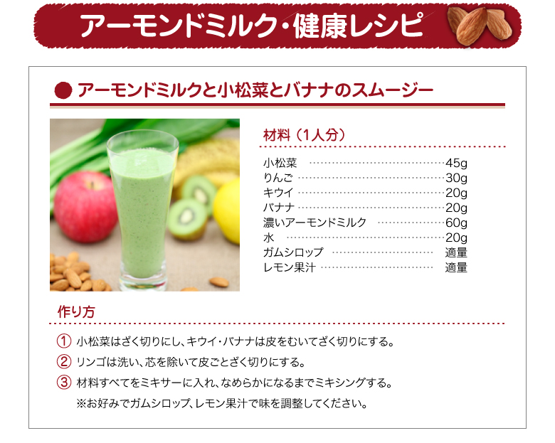 | 原材料名 | アーモンド(アメリカ)、pH調整剤、増粘剤(ジェラン) |