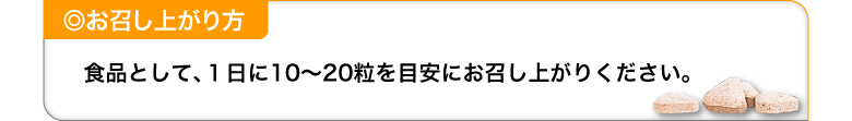 | お召し上がり方 | 健康補助食品として1日10~20粒を目安に数回に分けお召し上がり下さい。尚、本品は噛んでもお召し上がりいただけます。 |
