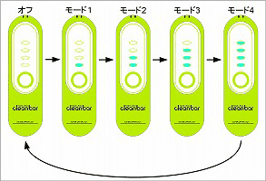 操作は簡単。スイッチはたった一つ。スイッチを押す毎に、動作モードがモード1(弱)~モード4(強)、オフと変化します。また動作状態をランプの点灯する数で表示します。