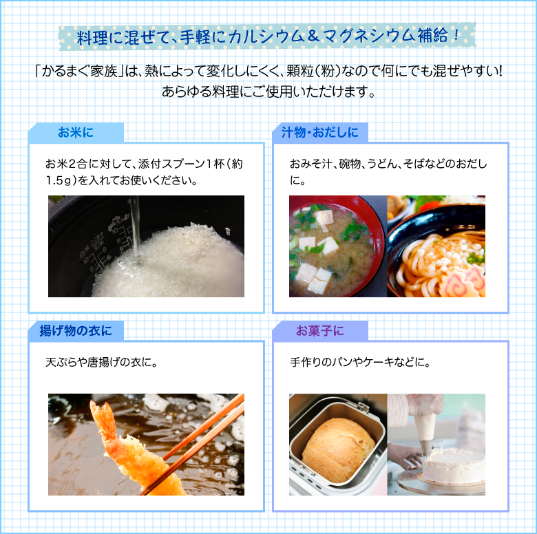 | 原材料名 | 【カルシウム強化剤製剤 食品添加物】乳酸カルシウム68.5% 、硫酸マグネシウム31.5% |