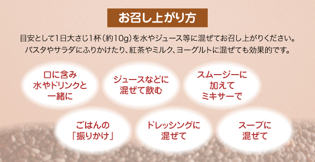 | お召上がり方 | 目安として1日大さじ1杯(約10g)を水やジュース等に混ぜてお召し上がりください。パスタやサラダにふりかけたり、紅茶やミルク、ヨーグルトに混ぜても効果的です。 |
