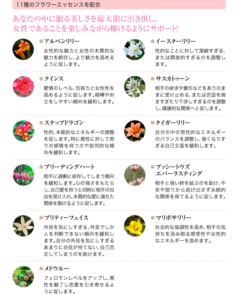 | 原材料名 | メドウルー、プリティーフェイス、タイガーリリー、マリポサリリー、クインス、サスカトゥーン、アルペンリリー、プッシートーズエバーラスティング、イースターリリー、ブリーディングハート、グリセリン |