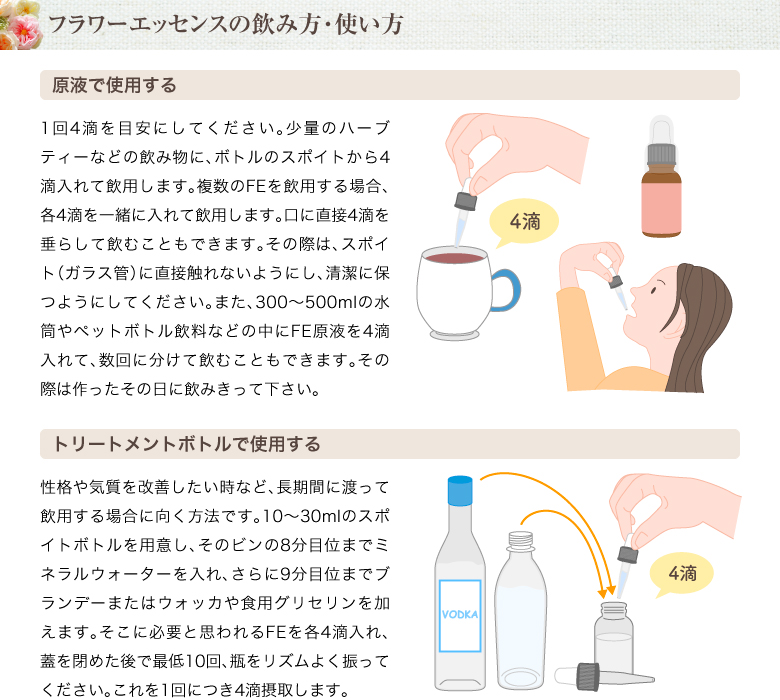 | 使用方法 | 1回4~5滴をスポイトから直接、又はお飲み物に垂らしてお飲みください。スポイト(ガラス管部分)は、直接皮膚などに触れないようにし清潔に保つようにして下さい。 |