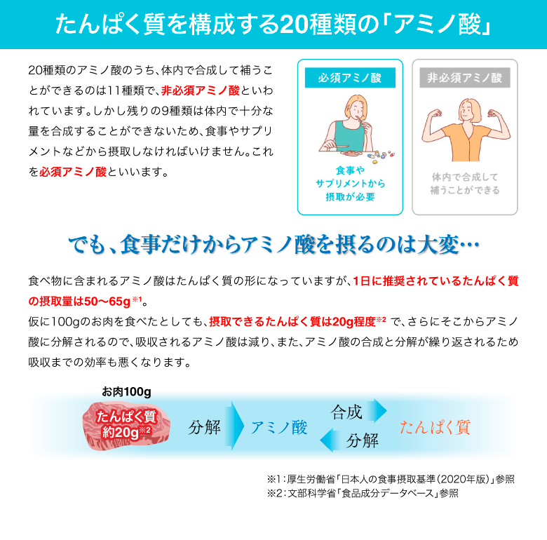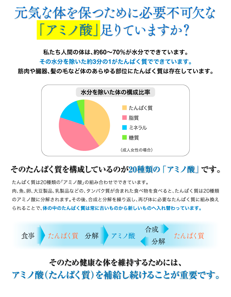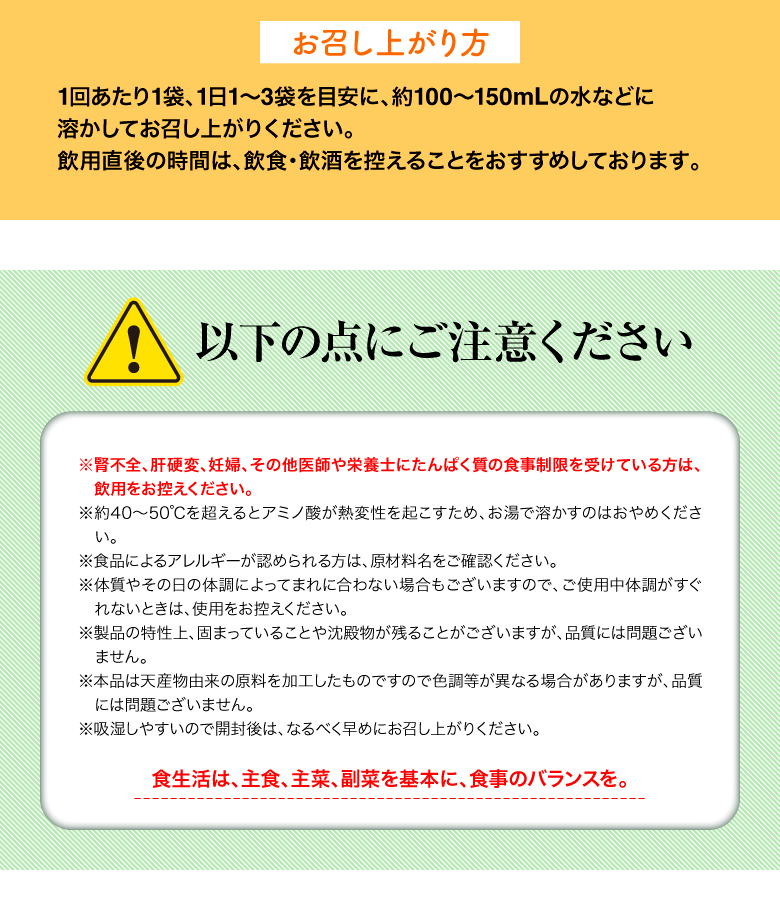 | お召し上がり方 | 食品なので、基本的にいつ摂っても問題ありません。身体は寝ている間に受けたダメージを一気に回復しようとします。 そのときに、材料・燃料としてアミノ酸を使うので、アミノ酸を効率良く使うには夜の間にアミノ酸を補給することがコツです。 1日に1~3袋を目安に本品1袋を少量の水(100ml)に溶かしてお召し上がりください。飲用前後の1時間は飲食・飲酒を控えることをおすすめしております。食品なので、基本的にいつ摂っても問題ありません。身体は寝ている間に受けたダメージを一気に回復しようとします。そのときに、材料・燃料としてアミノ酸を使うので、アミノ酸を効率良く使うには夜の間にアミノ酸を補給することがコツです。1日に1~3袋を目安に本品1袋を少量の水(100ml)に溶かしてお召し上がりください。飲用前後の1時間は飲食・飲酒を控えることをおすすめしております。※お子様へ飲用について・・・離乳食が食べられるようになれば、栄養補給の意味でも大変良いです。(乳幼児の場合、ミルクを飲む際にオレンジフレーバーで乳製品が固化し気管を詰まらせる可能性がありますので、与えるときは充分ご注意ください。) |