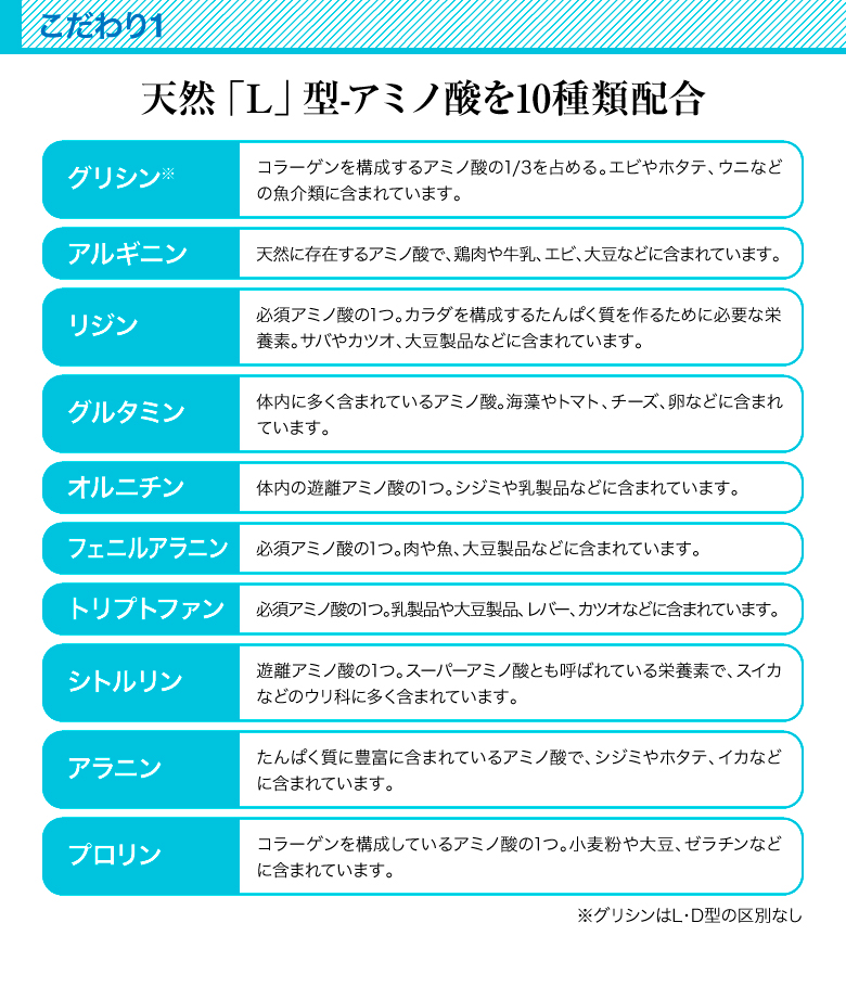 | 原材料名 | L-オルニチン塩酸塩、果汁パウダー(オレンジ濃縮果汁、デキストリン、温州みかん濃縮果汁)、温州みかん果皮末、ファイバーソル2(水溶性食物繊維)、L-シトルリン、赤ワインエキス末、グリシン、トレハロース、L-グルタミン、L-アルギニン、クエン酸、L-リジン塩酸塩、L-アラニン協和、香料、L-プロリン、ビタミンC、L-トリプトファン、L-フェニルアラニン、甘味料(ステビア)、パントテン酸カルシウム、β-カロチン、ナイアシン、V.B1、V.B2、V.B6、(一部にオレンジ含む) |