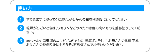 | ご使用方法 | 適量を取り、肌になじませます。 |