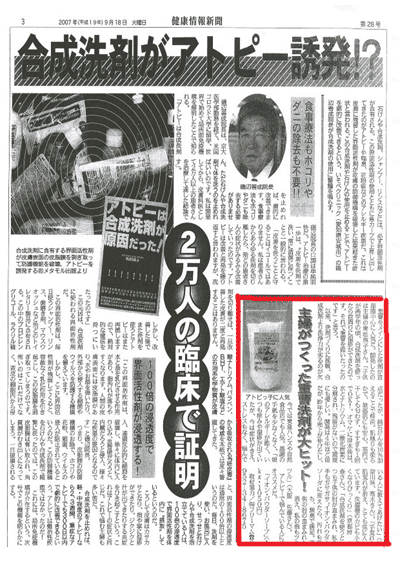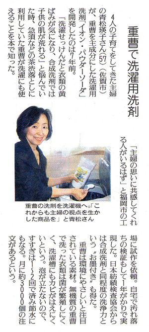 主婦がつくった重曹洗剤が大ヒット!(2007.9.18健康情報新聞、2009.5.17 読売新聞他)