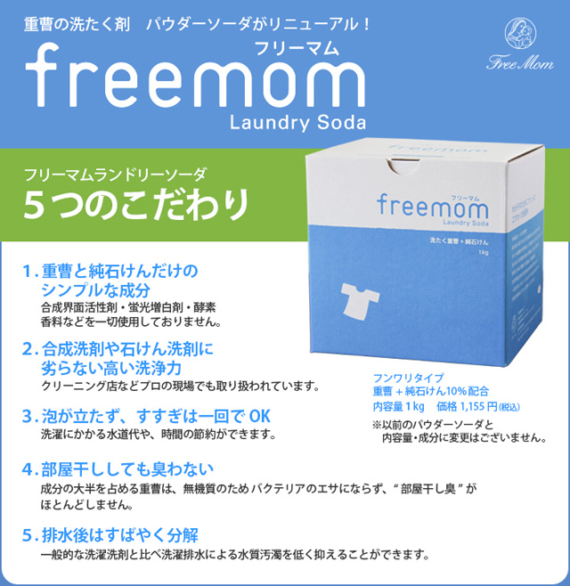 | 重曹パワー 重曹は弱アルカリ性なので、酸性の汚れを中和させる力があります。フリーマム独自の製法により生まれたパウダーソーダは、衣類のせんたく用洗剤としての効力を発揮し衣類の汚れをすっきり洗い流してくれます。また仕上がりも自然の柔らかさで 柔軟剤は要りません。泡は立たず、衣類への残留が少ないので、すすぎは1回でOKです。水道代の大幅な節約にもなります。 (※汚れの強いもの、厚手のものは2回のすすぎをオススメします。) 腐敗臭を抑制、環境に優しく自然に還る 重曹は無機質成分のため、菌類のエサにならず、洗濯層のカビ、室内干しの際の腐敗臭を抑制します。継続して使用する事で、洗濯槽もきれいになります。 排水後は水をナトリウムと二酸化炭素に分解し、すばやく自然に還ります。環境に最も優しい洗濯洗剤です。 |