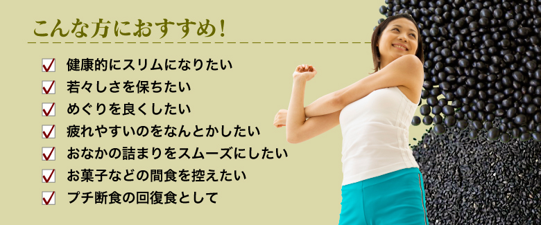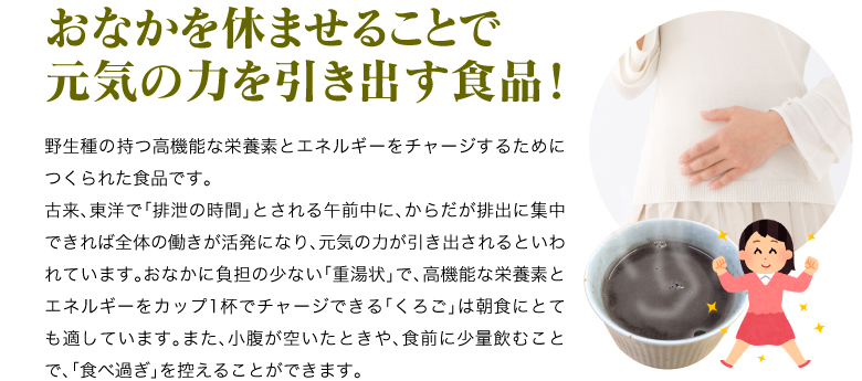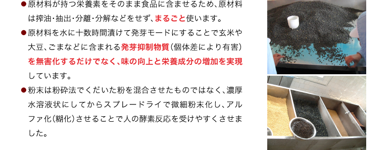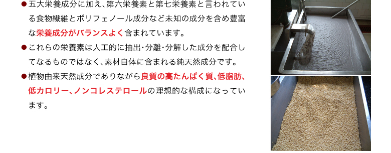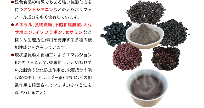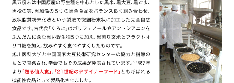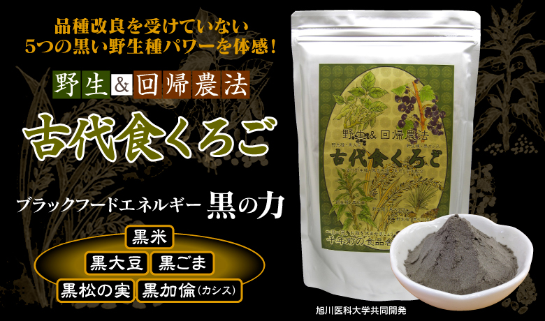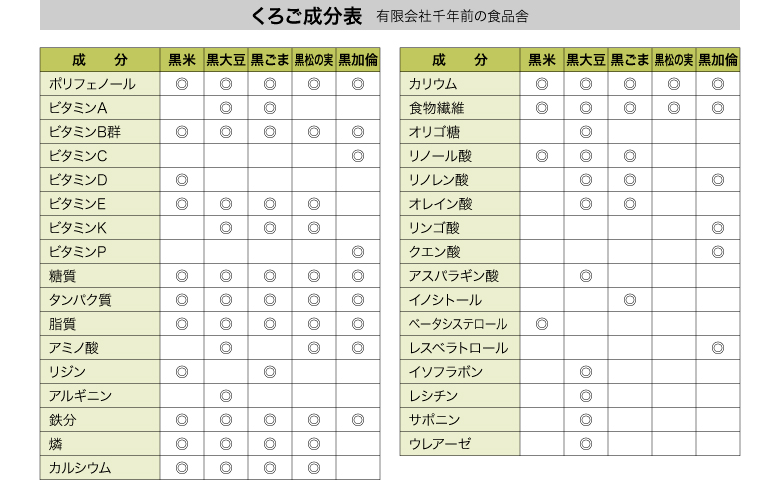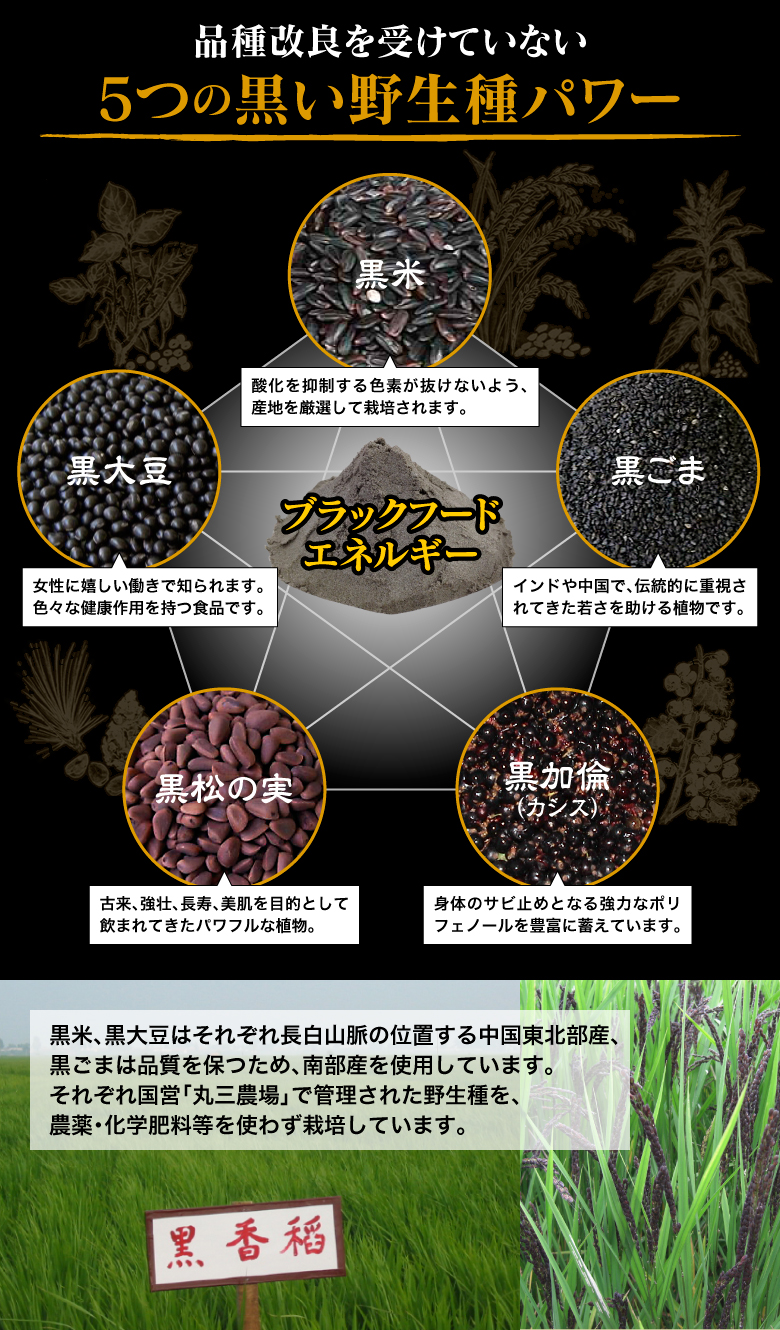 | 原材料名 | 黒五(黒米、黒大豆、黒胡麻、黒松の実、黒かりん(仏名カシス))、フラクトオリゴ糖、黒煎玄米、野生植物抽出ミネラルマグマ |