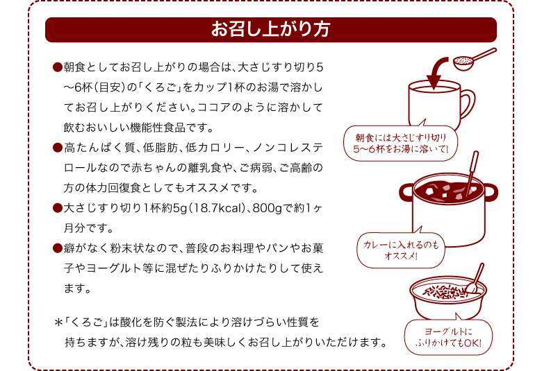 | お召し上がり方 | カップ1杯の湯か水に大さじ擦り切り5杯から6杯を好みの濃さに溶かしてお召し上がり下さい。 |