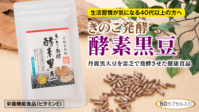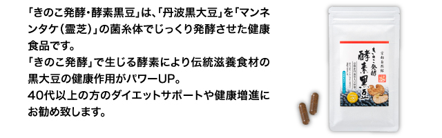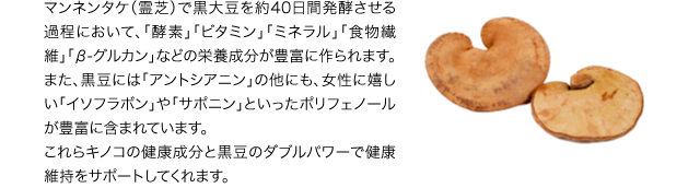 | 原材料名 | 黒大豆(京都産/遺伝子組み換えでない)・マンネンタケ菌糸体・寒天・ガラクトオリゴ糖・ビタミンE・ヒドロキシプロピルメチルセルロース |