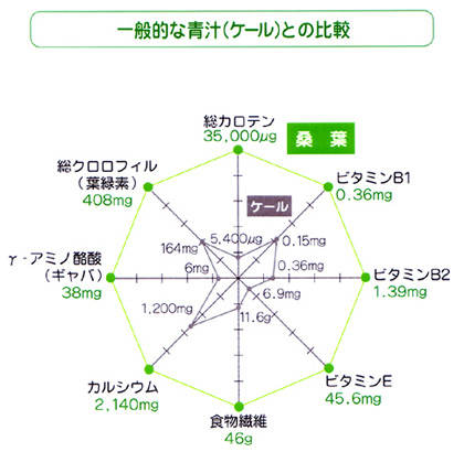 | 原材料 | 桑葉末、大麦若葉末、α化でんぷん、有胞子乳酸菌 | ||||||||||||||||||