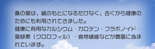 「桑葉青汁 おいしい緑」は、自然肥料だけで大切に育てられた桑の葉を使用し、独自の製法で有用成分を高濃度に活かしております。