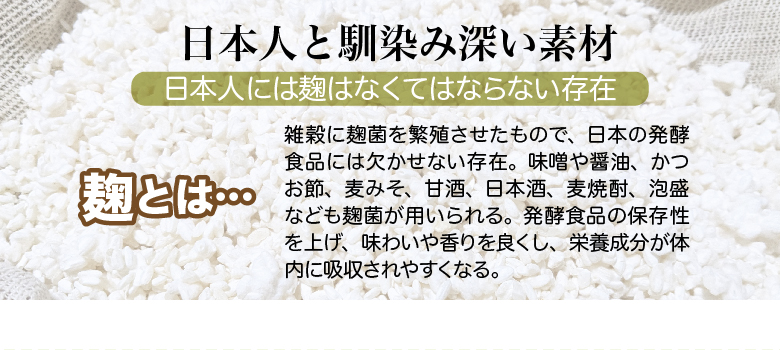 | 原材料名 | 穀物麹(大麦、あわ、ひえ、きび、タカキビ、紫黒米、米粉)(国内製造)、穀物発酵エキス(小麦を含む)、マルトデキストリン/HPMC、ステアリン酸Ca |
