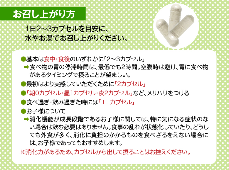 | お召し上がり方 | 1日2~3カプセルを水またはお湯でお召し上がりください。 |