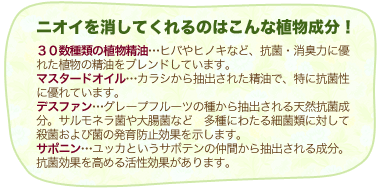 | 材料・材質 | フィトンα(植物精油成分、マスタードオイル、デスファン(グレープフルーツの種の抽出成分)) |