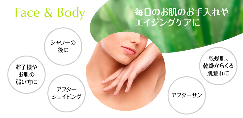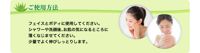| ご使用方法 | フェイスとボディに使用してください。シャワーや洗顔後、お肌の気になるところに薄くなじませてください。少量でよく伸びしっとりします。 ※乳化剤、油分、石油系成分を含みません。 ※ドイツのデルマテスト®による皮膚科学試験済みですので敏感肌の方でも安心してお使いいただけます。 ※毎日のお手入れやエイジングケアにも最適です。 ※お肌に異常が生じていないかよく注意して使用してください。 ※お肌に合わない時はご使用をお止めください。 |