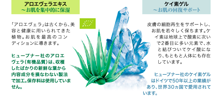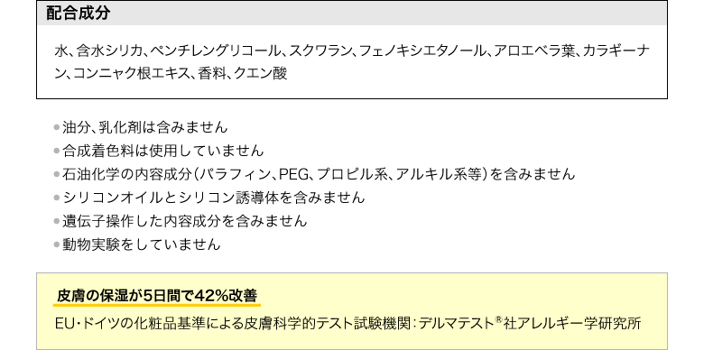 | 全配合成分 | 水、含水シリカ、ペンチレングリコール、スクワラン、フェノキシエタノール、アロエベラ葉、カラギーナン、コンニャク根エキス、香料、クエン酸 |