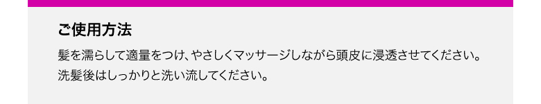 髪を濡らして適量をつけ、やさしくマッサージしながら頭皮に浸透させてください。洗髪後はしっかりと流してください。 |