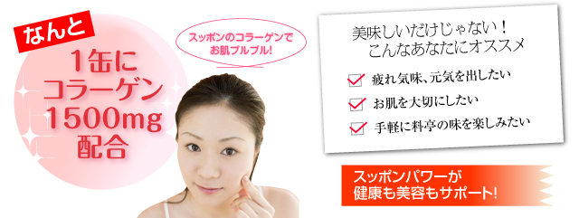 | 栄養成分表示(1缶190gあたり) | 熱量/21kcal、たんぱく質/2.5g、脂質/0.4g、炭水化物/1.9g、ナトリウム/688mg、コラーゲン/1500mg |