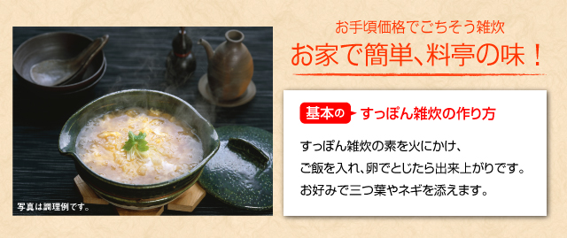 | お召し上がり方 | 鍋にスッポン雑炊の素1缶と、茶碗に軽く1杯(100g)のご飯を入れ2、3分煮てください。仕上げに溶き卵を入れ、ひと煮立ちで出来上がりです。 |