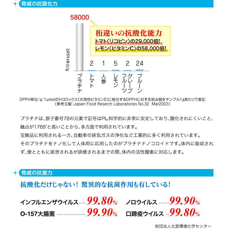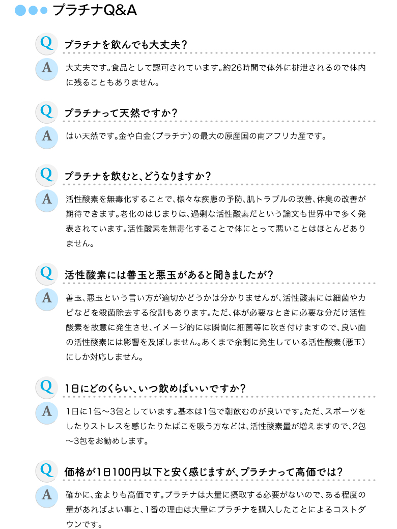| 原材料名 | 【高分子多糖体抽出原料】難消化デキストリン、白金、クエン酸ナトリウム、重炭酸ナトリウム、無水クエン酸、二酸化ケイ素 |