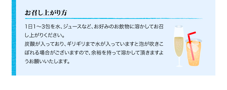 | お召し上がり方 | 1日1-3包を水またはぬるま湯に溶かしてお召し上がりください。炭酸が入っており、ギリギリまで水が入っていますと泡が吹きこぼれる場合がございますので、余裕をもって溶かしていただきますようお願いします。 |