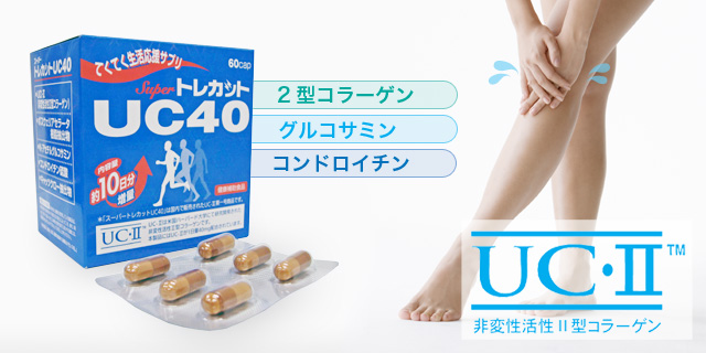 スーパートレカットUC40の主成分であるUC-II(非変性活性Ⅱ型コラーゲン)は、グルコサミン、コンドロイチンを諦めた方々に支持されている米国発の新サプリメント成分です。米国で数多くの大学教授が研究を手掛け、メカニズムが解明されたUC-IIはサプリメント大国であるアメリカでも大きな支持を得ています。さらにもう一つの主成分であるボスウェリアセラータ樹脂抽出物は、インド政府最優秀賞を受賞した天然ハーブ素材であり、UC-IIと同様に数多くの研究機関が注目している新素材です。高齢化社会の進む現代社会には欠かせないラクラク・テクテクの健康補助食品です。