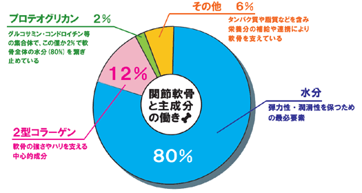 軟骨はこのような成分で形成されており、全体の2%のネバネバ成分"プロテオグリカン"が、滑液(=水分。軟骨全体の約80%)を吸ってスポンジのようにクッションの役割をしています。そして2型コラーゲン(軟骨全体の12%)が間を埋め尽くし、軟骨を強く支えています。