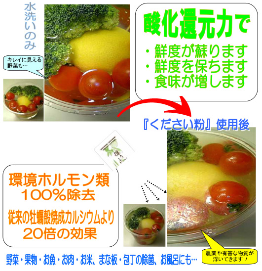 ください粉はホッキ貝を焼成してできた100%天然の抗菌洗浄パウダーです。野菜やくだものに付着した農薬・環境ホルモン・添加物を除去します。